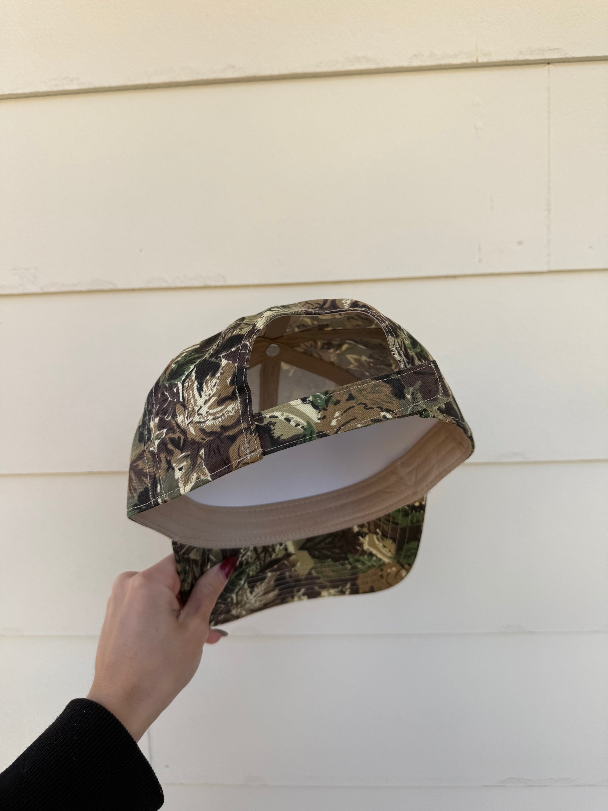 Unisex camo trucker hat featuring a camo crown and visor, crisp white embroidery, and an adjustable velcro clasp for the perfect fit.