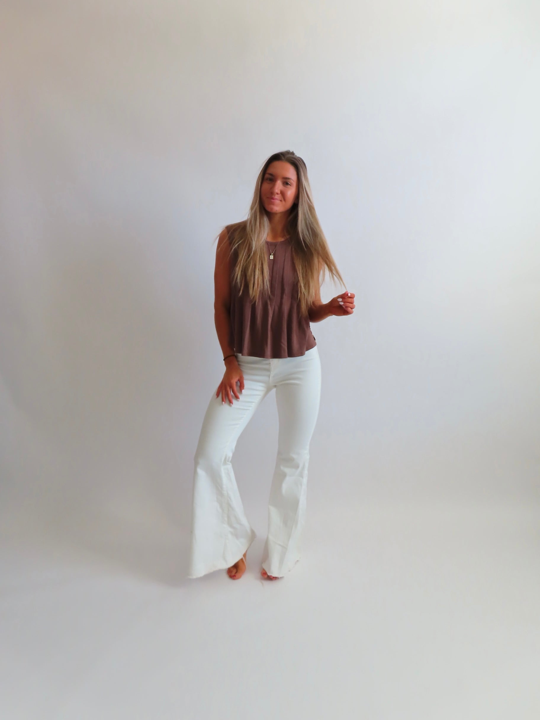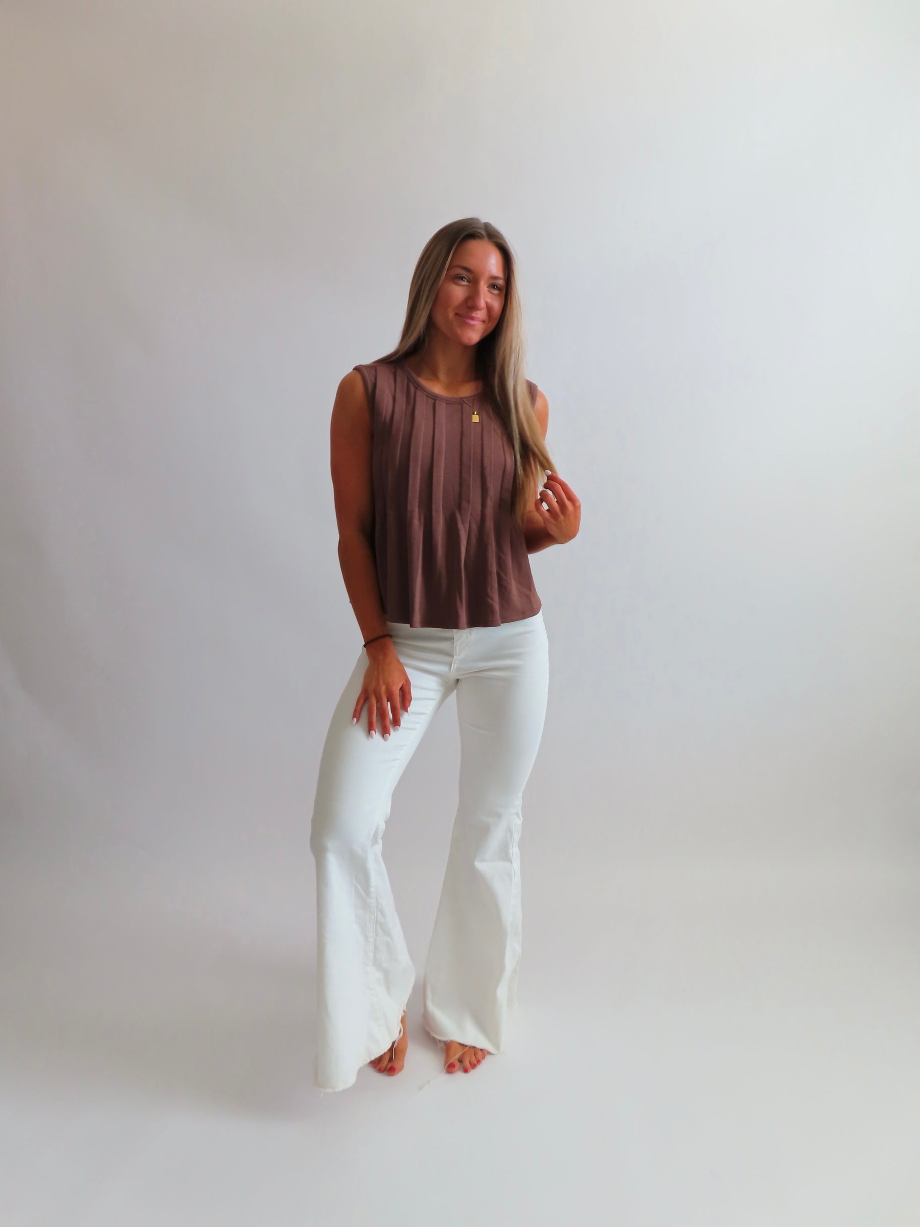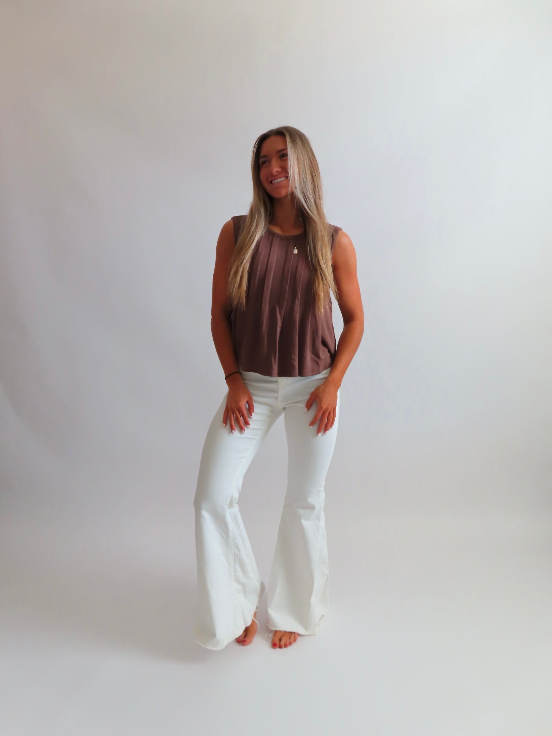This brown tank features a vertical pleated detail and a flowy fit made from a soft, thick fabric that holds its shape. It’s the perfect mix of comfort and effortless style. Pair it with jeans or tailored shorts for an easy everyday look, or layer it under a jacket or cardigan for a polished, put-together outfit.